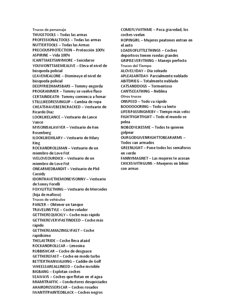 - Utilizar trucos de armas específicas: Hay trucos específicos para obtener armas individuales. Por ejemplo, para obtener una ametralladora, debes ingresar el código R1, R2, L1, R2, Left, Down, Right, Up, Left, Down, Right, Up, Triangle, Triangle, L1, R1, R2, L1, R2, Left, Down, Right, Up, Left, Down, Right, Up, Triangle, Triangle, L1, R1, R2, L1, R2, Left, Down, Right, Up, Left, Down, Right, Up, Triangle, Triangle, L1, R1, R2, L1, R2, Left, Down, Right, Up, Left, Down, Right, Up, Triangle, Triangle, L1, R1, R2, L1, R2, Left, Down, Right, Up, Left, Down, Right, Up, Triangle, Triangle, L1, R1, R2, L1, R2, Left, Down, Right, Up, Left, Down, Right, Up, Triangle, Triangle, L1, R1, R2, L1, R2, Left, Down, Right, Up, Left, Down, Right, Up, Triangle, Triangle, L1, R1, R2, L1, R2, Left, Down, Right, Up, Left, Down, Right, Up, Triangle, Triangle, L1, R1, R2, L1, R2, Left, Down, Right, Up, Left, Down, Right, Up, Triangle, Triangle, L1, R1, R2, L1, R2, Left, Down, Right, Up, Left, Down, Right, Up, Triangle, Triangle, L1, R1, R2, L1, R2, Left, Down, Right, Up, Left, Down, Right, Up, Triangle, Triangle, L1, R1, R2, L1, R2, Left, Down, Right, Up, Left, Down, Right, Up, Triangle, Triangle, L1, R1, R2, L1, R2, Left, Down, Right, Up, Left, Down, Right, Up, Triangle, Triangle, L1, R1, R2, L1, R2, Left, Down, Right, Up, Left, Down, Right, Up, Triangle, Triangle, L1, R1, R2, L1, R2, Left, Down, Right, Up, Left, Down, Right, Up, Triangle, Triangle, L1, R1, R2, L1, R2, Left, Down, Right, Up, Left, Down, Right, Up, Triangle, Triangle, L1, R1, R2, L1, R2, Left, Down, Right, Up, Left, Down, Right, Up, Triangle, Triangle, L1, R1, R2, L1, R2, Left, Down, Right, Up, Left, Down, Right, Up, Triangle, Triangle, L1, R1, R2, L1, R2, Left, Down, Right, Up, Left, Down, Right, Up, Triangle, Triangle, L1, R1, R2, L1, R2, Left, Down, Right, Up, Left, Down, Right, Up, Triangle, Triangle, L1, R1, R2, L1, R2, Left, Down, Right, Up, Left, Down, Right, Up, Triangle, Triangle, L1, R1, R2, L1, R2, Left, Down, Right, Up, Left, Down, Right, Up, Triangle, Triangle, L1, R1, R2, L1, R2, Left, Down, Right, Up, Left, Down, Right, Up, Triangle, Triangle, L1, R1, R2, L1, R2, Left, Down, Right, Up, Left, Down, Right, Up, Triangle, Triangle, L1, R1, R2, L1, R2, Left, Down, Right, Up, Left, Down, Right, Up, Triangle, Triangle, L1, R1, R2, L1, R2, Left, Down, Right, Up, Left, Down, Right, Up, Triangle, Triangle, L1, R1, R2, L1, R2, Left, Down, Right, Up, Left, Down, Right, Up, Triangle, Triangle, L1, R1, R2, L1, R2, Left, Down, Right, Up, Left, Down, Right, Up, Triangle, Triangle, L1, R1, R2, L1, R2, Left, Down, Right, Up, Left, Down, Right, Up, Triangle, Triangle, L1, R1, R2, L1, R2, Left, Down, Right, Up, Left, Down, Right, Up, Triangle, Triangle, L1, R1, R2, L1, R2, Left, Down, Right, Up, Left, Down, Right, Up, Triangle, Triangle, L1, R1, R2, L1, R2, Left, Down, Right, Up, Left, Down, Right, Up, Triangle, Triangle, L1, R1, R2, L1, R2, Left, Down, Right, Up, Left, Down, Right, Up, Triangle, Triangle, L1, R1, R2, L1, R2, Left, Down, Right, Up, Left, Down, Right, Up, Triangle, Triangle, L1, R1, R2, L1, R2, Left, Down, Right, Up, Left, Down, Right, Up, Triangle, Triangle, L1, R1, R2, L1, R2, Left, Down, Right, Up, Left, Down, Right, Up, Triangle, Triangle, L1, R1, R2, L1, R2, Left, Down, Right, Up, Left, Down, Right, Up, Triangle, Triangle, L1, R1, R2, L1, R2, Left, Down, Right, Up, Left, Down, Right, Up, Triangle, Triangle, L1, R1, R2, L1, R2, Left, Down, Right, Up, Left, Down, Right, Up, Triangle, Triangle, L1, R1, R2, L1, R2, Left, Down, Right, Up, Left, Down, Right, Up, Triangle, Triangle, L1, R1, R2, L1, R2, Left, Down, Right, Up, Left, Down, Right, Up, Triangle, Triangle, L1, R1, R2, L1, R2, Left, Down, Right, Up, Left, Down, Right, Up, Triangle, Triangle, L1, R1, R2, L1, R2, Left, Down, Right, Up, Left, Down, Right, Up, Triangle, Triangle, L1, R1, R2, L1, R