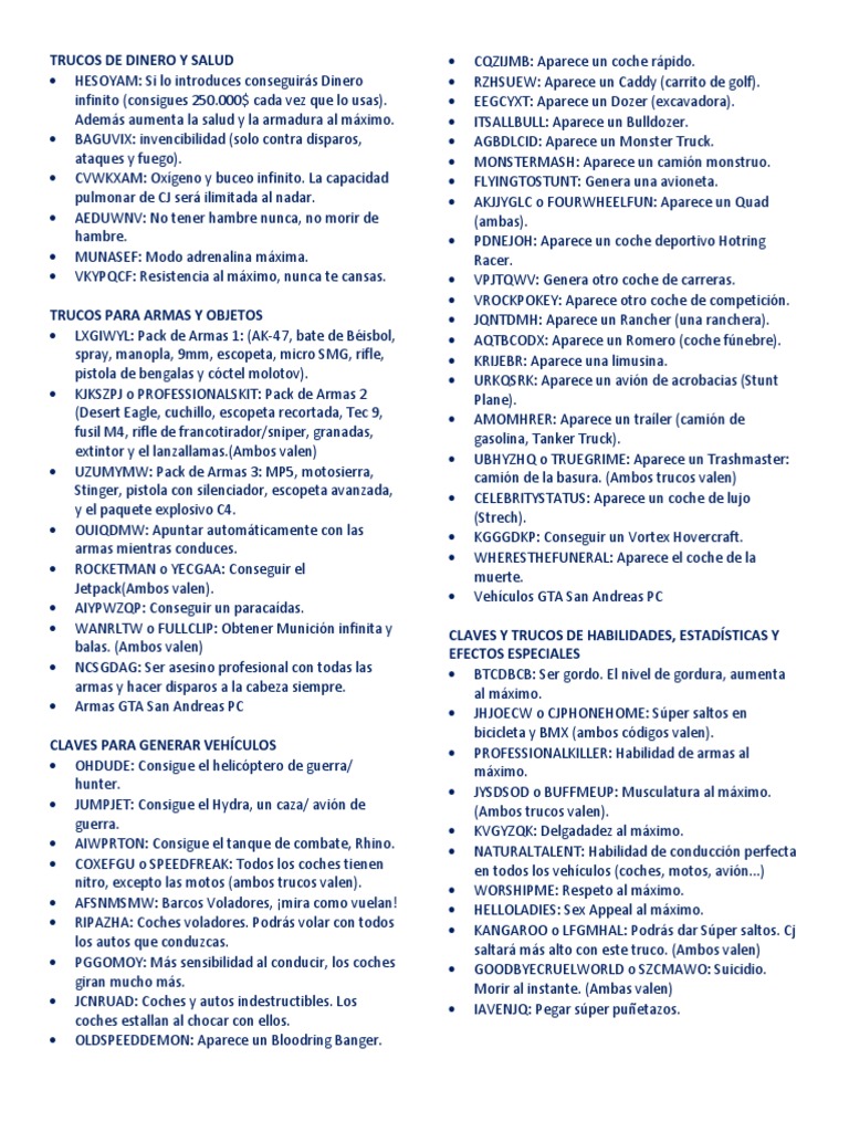 Para dominar el juego de GTA San Andreas en PC, es importante conocer los trucos adecuados. A continuación, se presentan algunos de los más relevantes y útiles trucos para que puedas disfrutar al máximo de esta experiencia de juego.